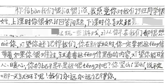 “ÔÚÐÂѧУʱ£¬ÄãÒ»¶¨Òª°ÑÕâ·âÐÅ´ø×Å£¬Èç¹ûÄãºÜÄѹý£¬¾Í¿´¿´Õâ·âÐÅÀïÃæµÄÄÚÈÝ£¬Ï£ÍûÄÜůÐÄ……”“Äãµ½ÁËÐÂѧУҪ½»Ò»¸öÐÂÅóÓÑ£¬²»ÒªÌìÌì¶¼Ïë×ÅÎÒÃÇ……”“ÒªÊÇÒÔºóÄãÏëÎÒÃÇ´ó¼Ò£¬¾Íµ±×÷ÎÒÃÇÔÚÄãÃæÇ°……”